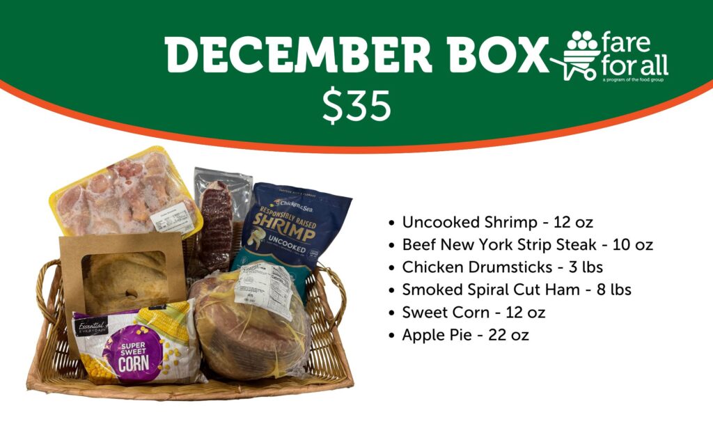 - Mega Meat Pack $25 — 6-8 frozen meat items (chicken, turkey, pork, beef, or fish)